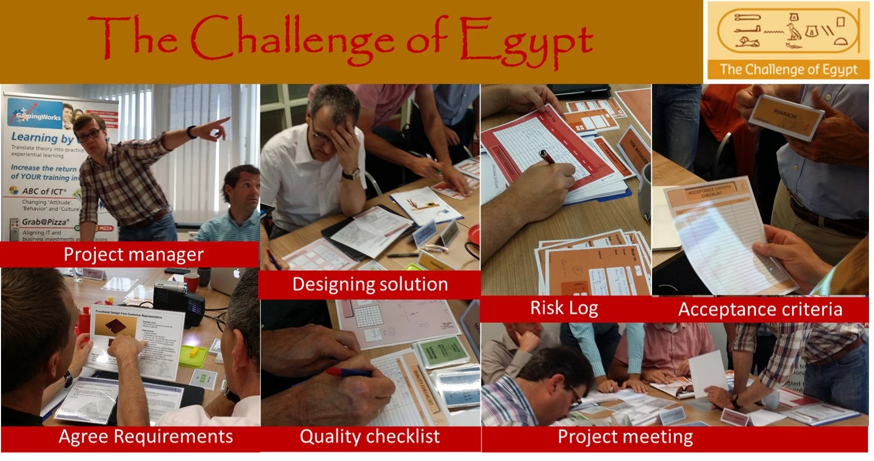 Scenario We are in ancient Egypt. The Pharaoh want’s the secure his afterlife and has a meeting with the High Priest. There is a workshop with a team of experts (Architects, Risk experts, Quarry experts, Nile expert and Construction workers), they interview the Pharaoh and they create this list of Products. Base on this the team will decide which products they can develop in the firsts SPRINT and step by step the team will develop all products. Even if the requirements of the Pharaoh change, the team will handle them all using AGILE principles.